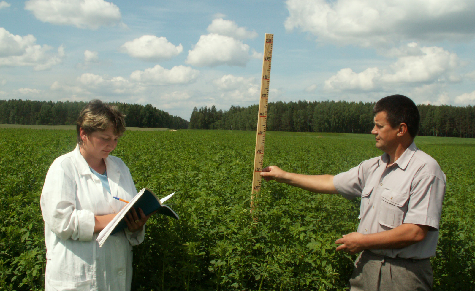 Научный сотрудник Валентина Крицкая и ведущий научный сотрудник отдела многолетних трав Евгений Чекель измеряют высоту растений донника белого