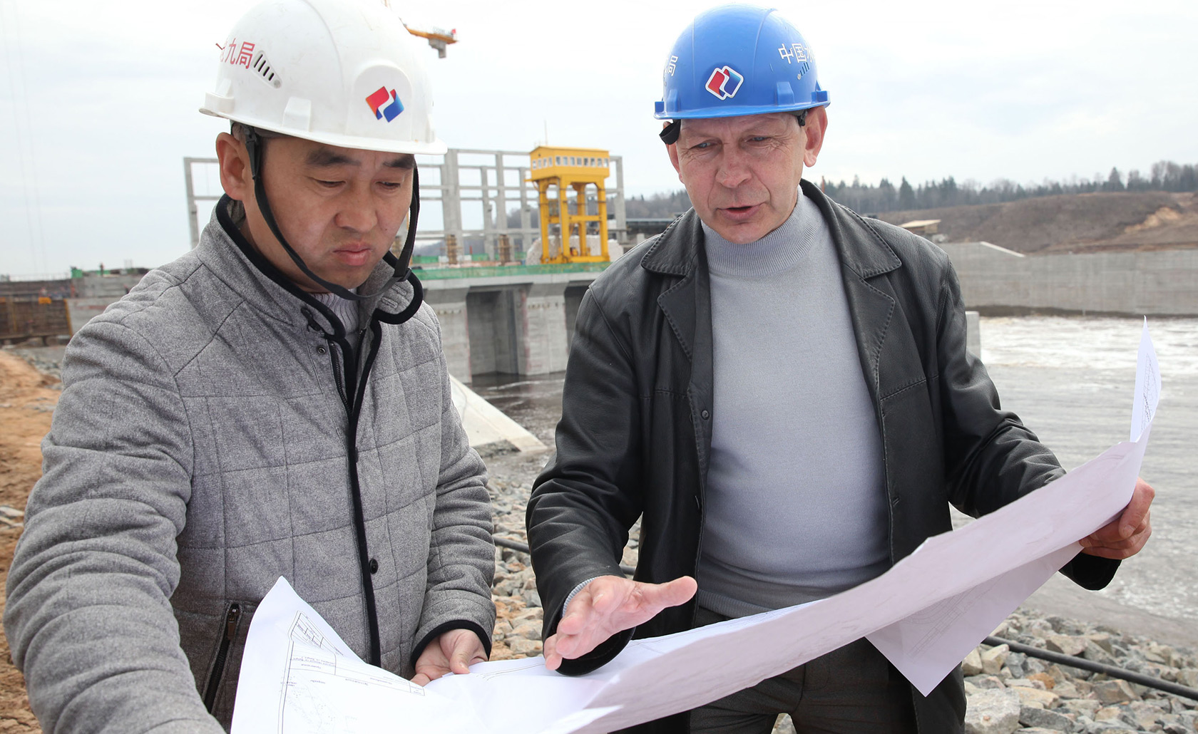 На строительной площадке Витебской ГЭС главный инженер Сун Вей Син и начальник управления по строительству Витебской ГЭС Иван Богачев